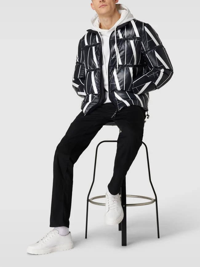Die Daunenjacke von Armani Exchange ist aus strapazierfähigem Material gefertigt und gerade geschnitten. Sie kommt mit Allover-Logo, Stehkragen und seitlichen Reißverschlusstaschen.